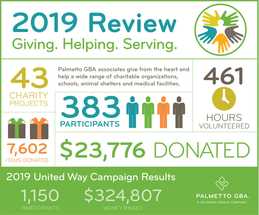 Palmetto GBA employees have a passion for serving our communities. Last year, nearly 400 associates came together to support local organizations through more than 40 charity projects and 7,600 donated items, volunteering 460 service hours and raising over $23,700.
