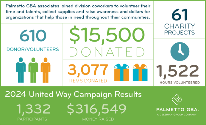 Palmetto GBA has a long-standing tradition of giving back to our local communities and helping those in need. This tradition continued in 2024, with associates collaborating within their work divisions to raise awareness, volunteer their time and talent and donate items and funds.