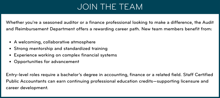 In her role as an auditor, she has been a standout member of the Audit and Reimbursement team. Georgina thrives on comparing cost reports to regulatory expectations and credits her supervisor for fostering a supportive, team-oriented environment. Her journey reflects the department’s commitment to excellence, learning and collaboration.