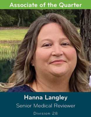 Hanna Langley has been selected as Division 28’s Associate of the Month for July because of her willingness to go beyond what is required of her to help the team provide superior customer service. As a senior medical reviewer in the Medicare Part A Medical Review department, Hanna often assists by answering provider questions via email, calling providers to offer assistance and helping her coworkers with training resources. Hanna is appreciated for her wealth of knowledge, positive attitude and her ability to keep a cool head in stressful situations.