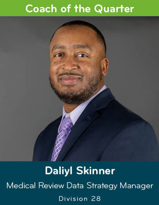 Daliyl Skinner is Division 28’s Coach of the Quarter for the third quarter of 2023. As a manager for the Medical Review Data Strategy Department, he didn’t just delegate tasks, he took the time to train members of his team and advance their skills. He also excelled at explaining important, and sometimes complex, concepts to clients. During weekly meetings, Daliyl encouraged his team to communicate and collaborate because he believes everyone has something to offer and collaboration will produce better results. While Daliyl has submitted many process improvements, he also helps others think through processes to generate improvements of their own. He is being recognized as a team player and a coach who excels at his job.