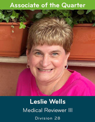 Division 28’s Associate of the Month for August is Leslie Wells, a medical reviewer III in the Data Strategy Department. She consistently provides high-quality service to both internal and external customers. Appreciated for being thorough in many of her key responsibilities, Leslie is always willing to take on new tasks and is a great asset to the Data Strategy Department and Palmetto GBA. She is a hard-working associate who promotes a positive attitude and teamwork.
